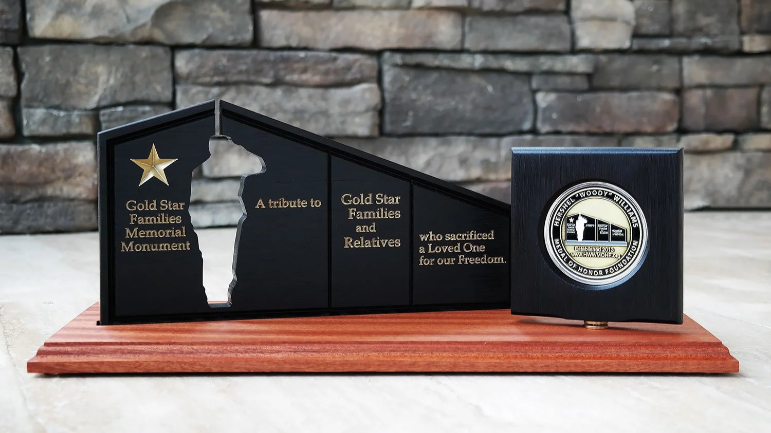 Every detail of the Woody Williams Foundation custom Monument Coin Display began with a shared mission—to create a lasting tribute worthy of a Medal of Honor recipient and the Gold Star Families. Our team at Coin Displays worked closely with the Foundation to design a custom display that would both protect and proudly showcase the Foundation’s commemorative challenge coin along side a replica of the Gold Star Families Memorial Monument. From early sketches to creating the first sample, the focus was on balance, elegance, and symbolism.